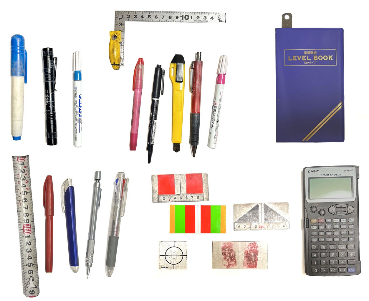 筆記具、マーカー、製図シャーペン、チョーク、定規、関数電卓、レベルブック、光波の反射シート…。